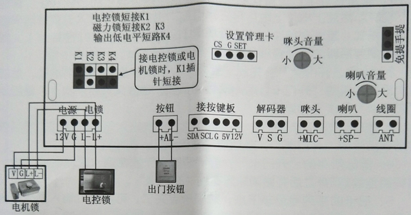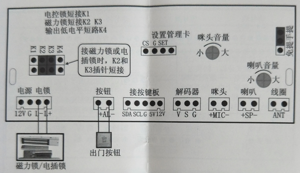 主機主板上的“K1~K4”插針(如圖5所示)是設置開鎖信號的,出廠時主機默認是接普通電鎖的(默認是短接K1,如圖7所示),如果使用磁力鎖或電插鎖,那么把插針帽換插到“K2和“K3” 插針的位置(即短接“K2”和“K3”插針,如圖8所示),如果需要輸出低電平信號,那么短接”K4”插針即可。
