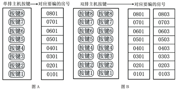 第六章中的6.3段已經(jīng)介紹了房號(hào)設(shè)置的方法,也就是數(shù)碼式主機(jī)的房號(hào)設(shè)置方法,那么直按式的主機(jī)房號(hào)應(yīng)該怎么編呢?下面來介紹下直按式主機(jī)每個(gè)按鍵所對(duì)應(yīng)的房號(hào)。
