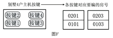 注意:編房號(hào)只用到分機(jī)上的“選曲”鍵和“開鎖”鍵這兩個(gè)按鍵(“選曲”鍵代表確認(rèn),“開鎖”鍵代表1~9中任意一位數(shù)),房號(hào)為4位編碼,不足4位的前面加0.