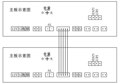 7、數(shù)據(jù)復(fù)制:斷電,撥掉主機(jī)按鍵板,用5P對(duì)插線插在按鍵板插座上,把2個(gè)主機(jī)板連接在起,如下圖所示:在目標(biāo)板主板上供電,供電后在目標(biāo)板上短路一下“GND管理卡”跳針,聽到繼電器振動(dòng)約10秒后停止數(shù)據(jù)即復(fù)制成功,這時(shí)2個(gè)主機(jī)板的卡數(shù)據(jù)相同,在多門口要求卡相同可以快速復(fù)制而不用每臺(tái)主機(jī)都用管理卡增加;